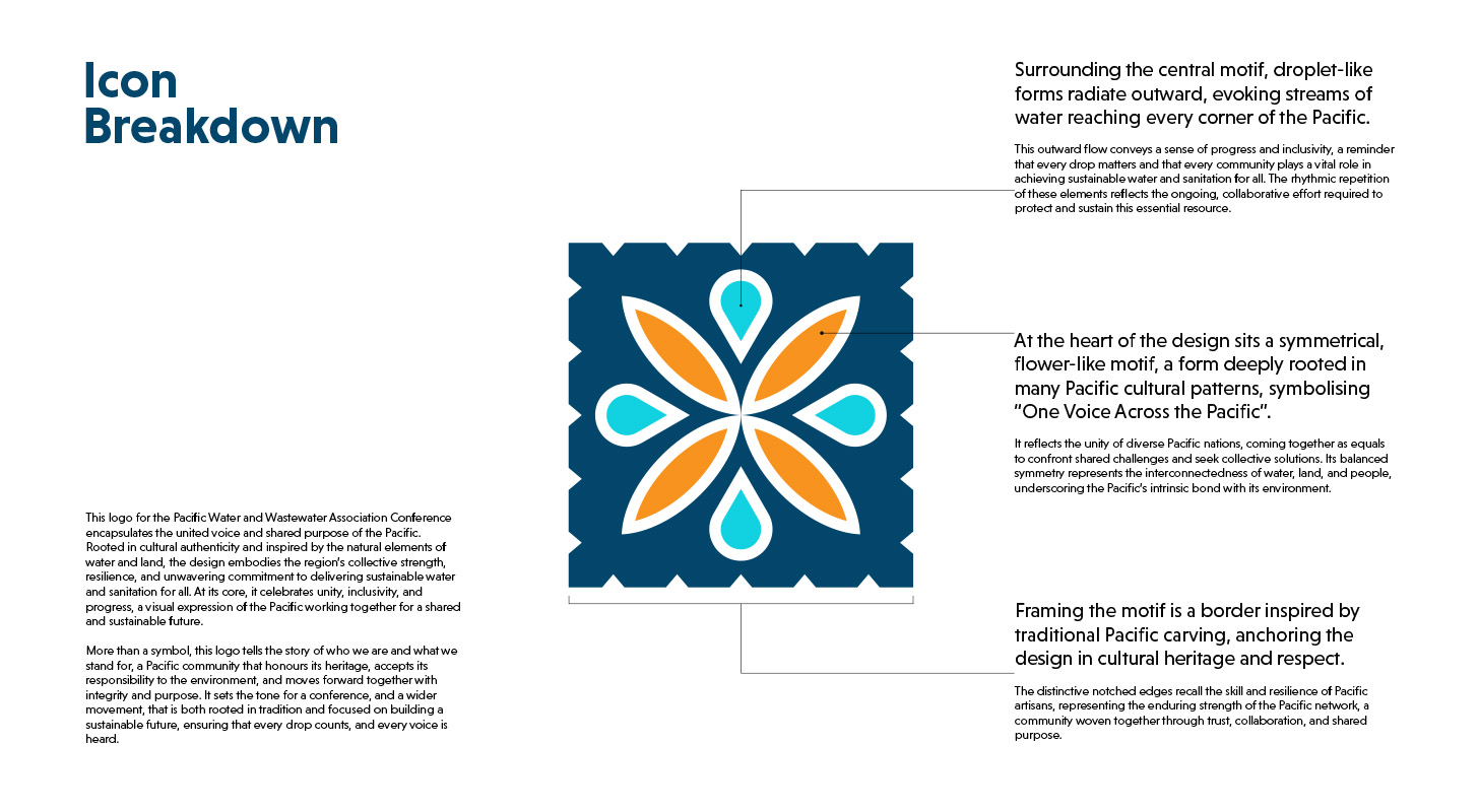 The logo created for the Pacific Water and Wastewater Association conference reflects the united voice and shared purpose of the Pacific inspired by the natural elements of water and land. The overall look of the logo embodies collective strength, resilience and commitment to sustainable water and sanitation for all.