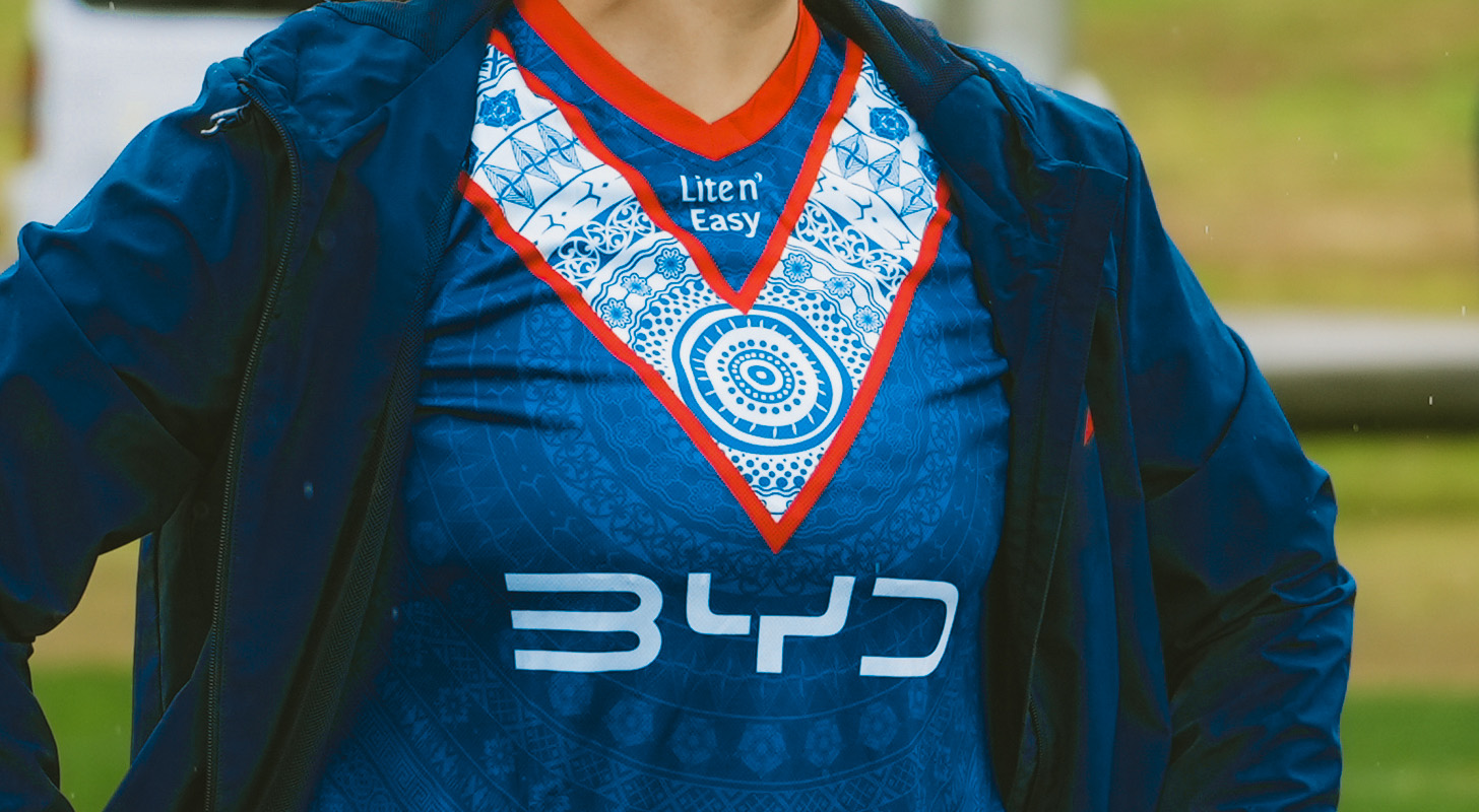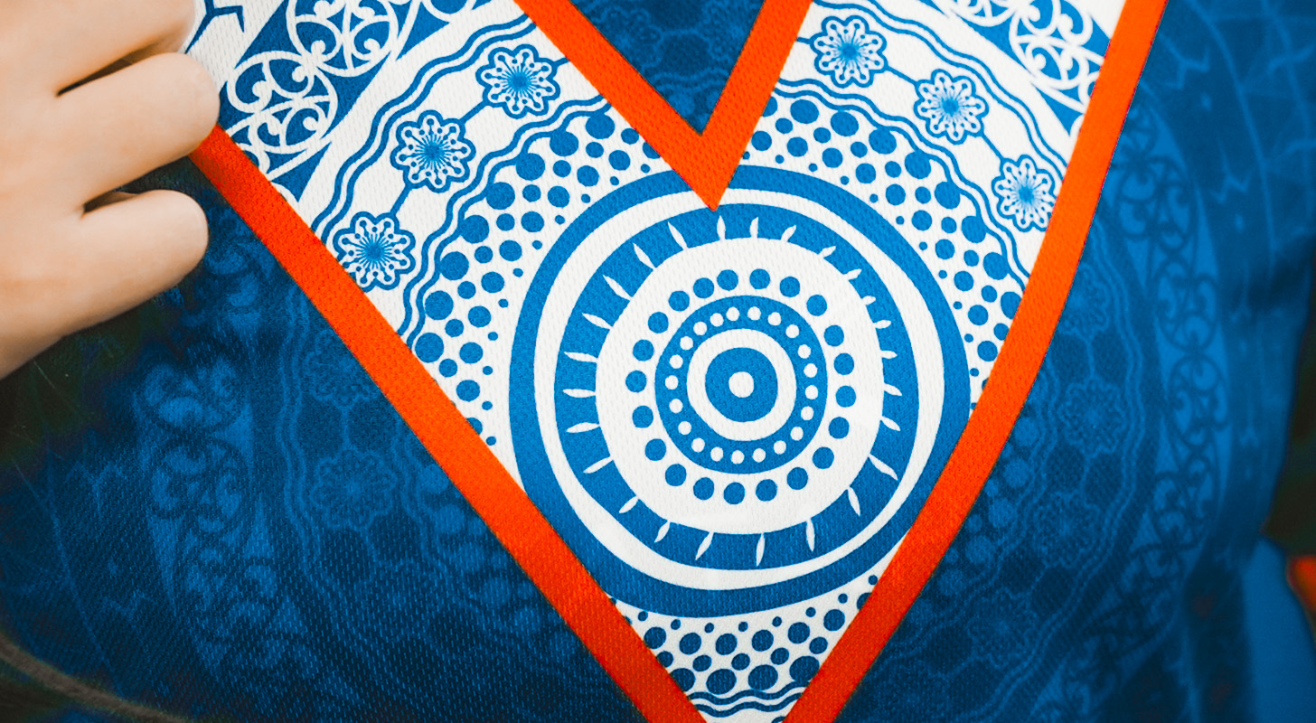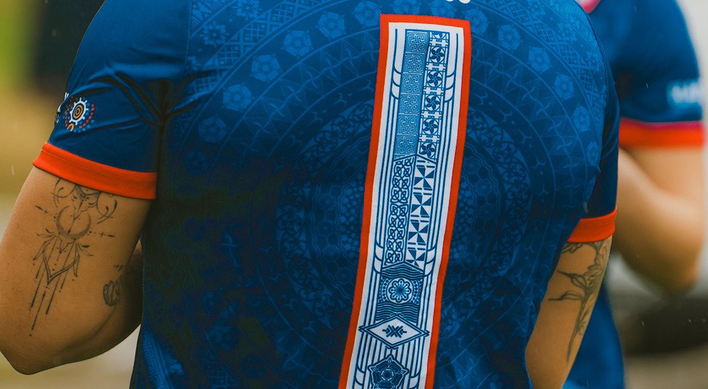 Using the main playing jersey as a layout template, the iconic ‘V’ strip at the centre of the chest serves as a focal point for the cultural designs. The design featured at the base of the jersey is an inverted colour way of the V-Strip pattern. Encircling this base design are flowing ocean waves, a tribute to the oceanic culture of Australia and the deep connection many of the communities share with the sea. The back of the design was inspired by the diverse cultures represented with the team symbolising unity, strength, and the collective backbone of the organisation.