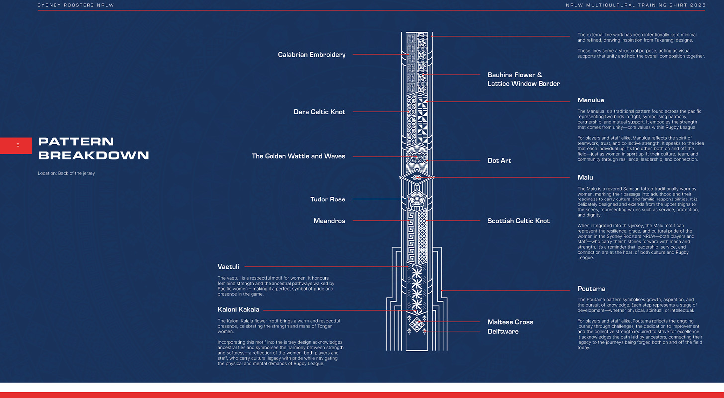 The mission for this project was to design a training jersey for the Sydney Roosters NRLW organisation celebrating the rich cultural identities of the women who wear it honouring their roots, ancestors, and the communities they represent.